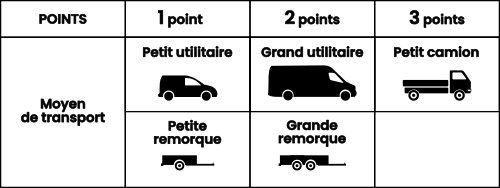 - Un système de points par catégorie de véhicule est appliqué. La valeur du point est fixée à 16€ dans les 3 déchèteries en 2026.Les points véhicules et remorques se cumulent.